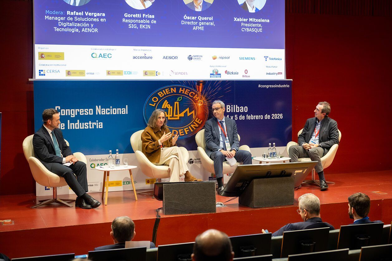 Rafael Vergara, mánager de Soluciones en Digitalización y Tecnología de AENOR, moderó la mesa Ciberseguridad industrial desde el diseño: certificación y resiliencia para la industria conectada, integrada por Xabier Mitselena, presidente de Cybasque; Goretti Frías, responsable SIG de Ekin-Group; y Óscar Querol, director general de la Asociación de Fabricantes de Material Eléctrico (AFME).