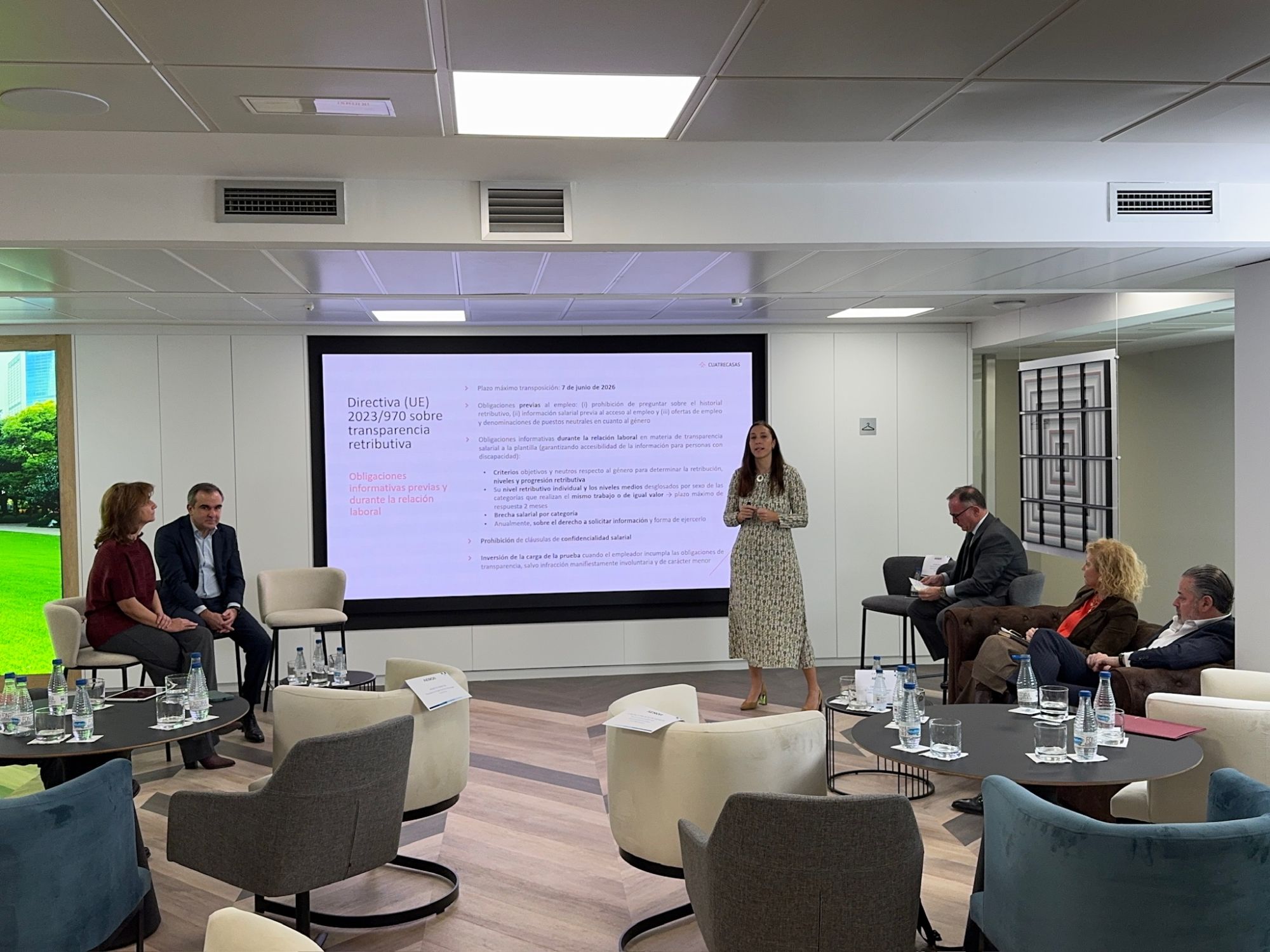 Durante la jornada se celebraron dos mesas redondas moderadas por Susana Estudillos. En la primera, Retos legales de la normativa, participaron Gonzalo Palacio de Ugarte, socio responsable del Departamento Laboral, y Almudena Batista Jiménez, socia del Departamento Laboral de Cuatrecasas. De la teoría a la práctica empresarial, fue un espacio donde Marta Martín, People & Organization Manager de Toyota, y José Ángel López Palomo, director corporativo de Compensación y Beneficios de Santalucía, compartieron las experiencias de sus organizaciones en este ámbito.
